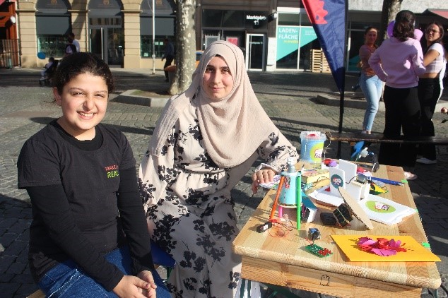 Am Stand können die jungen Besucherinnen sehen, was die Mädchen im mobilen Makerspace schon alles selbst gebaut haben - das Spiel mit dem heißen Draht zum Beispiel. Hana zeigt, wie es geht. „Das Spiel macht richtig Spaß. Wir haben das Spiel selbst gebaut und zugleich habe ich auch ganz viel über Stromkreis gelernt. Das spiele ich richtig oft zuhause mit meinem Bruder", erzählt die zwölfjährige Hana. Seit Monaten kommt sie begeistert zu MAKEitREAL und gehört inzwischen zum festen Stamm. Für sie ist heute sogar eine besondere Prämiere: Sie steht hinter dem Stand als Ansprechpartnerin für Gleichaltrige. Auch Angeli, 13 Jahre, hat gleich Feuer gefangen: „Man kann bei MAKEitREAL richtig experimentieren! Es ist ein toller Kontrast zum Alltag. Ich finde es gut, dass es das für Mädchen gibt.“ Für die beiden war es ein toller und spannender Tag, da sie im Mittelpunkt standen und MAKEitREAL repräsentierten.
